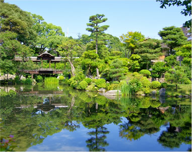 池泉回遊式庭園を有する東本願寺の別邸です。1641年に将軍・徳川家光から当地を寄進され、文人・石川丈山の趣向を入れた作庭がなされました。変化に富んだ景観は「十三景」と称され、高い評価を得ています。