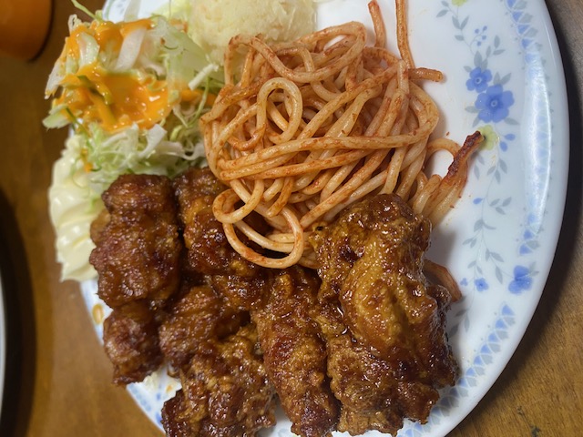 私がいただいたのは「とり天南蛮」です。しっかりとした味付けにマヨネーズ系のソースがあってご飯がすすみます。プレートにナポリタンもついて昔ながらの美味しさです。