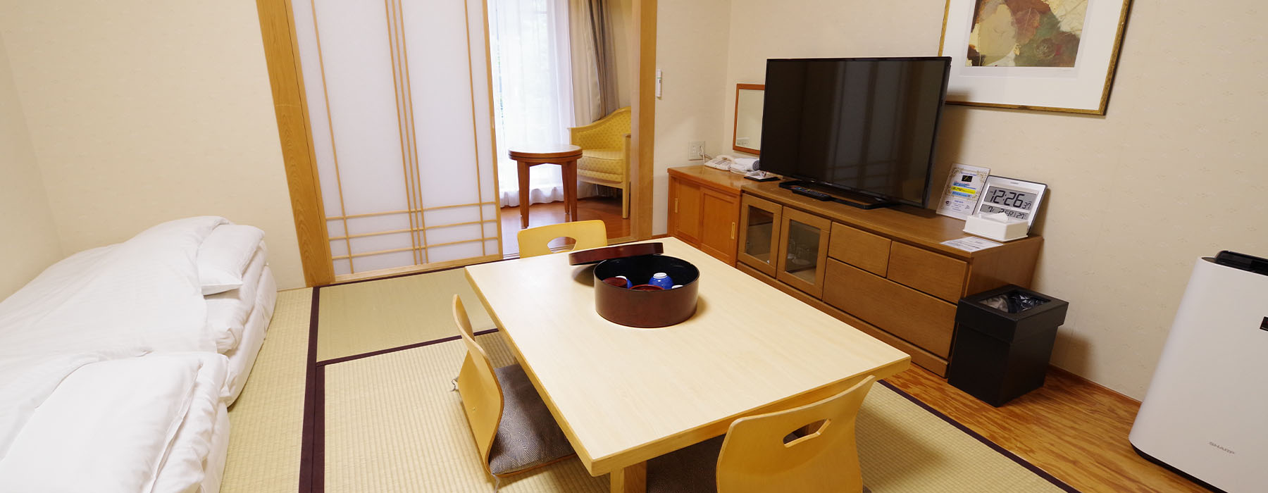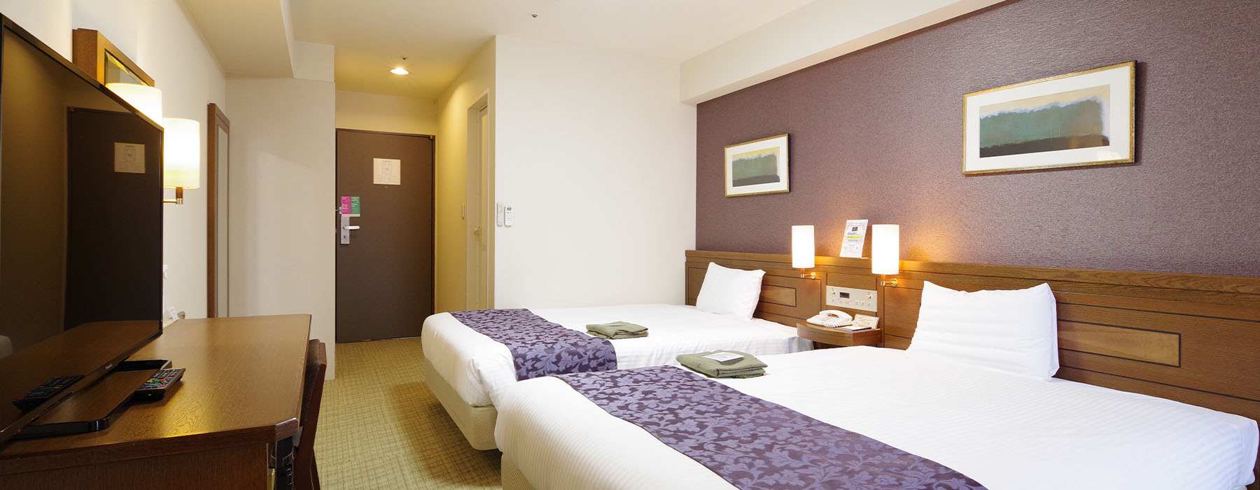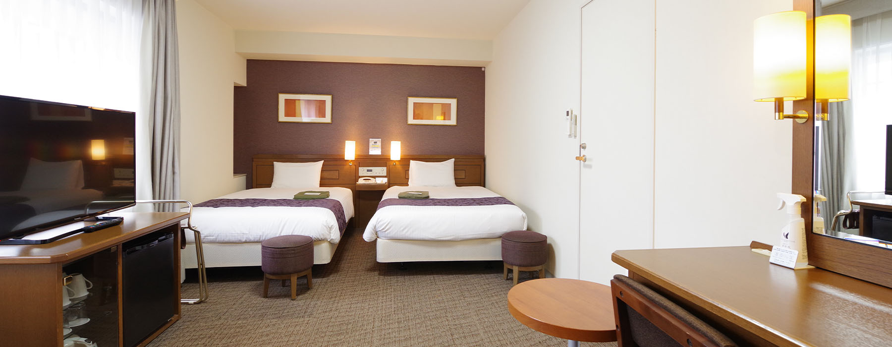 | 客室設備一覧 | テレビ / インターネット接続(Wi-Fi可) / バス / 洗浄機付トイレ / 冷暖房 / 加湿機能付き空気清浄機 / 冷蔵庫(中身は空) / 電気ポット / ドライヤー / 携帯充電器 / LANケーブル / 清水香 / ハンガー / くつべら / 目覚まし時計 / ズボンプレッサー(無料貸出) |