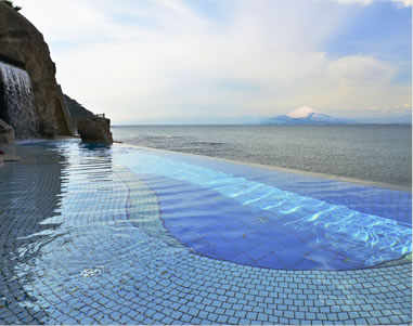 “えのすぱ”の通称で知られるスパリゾートで、天然温泉「富士海湯」のほか、トリートメントサロンやレストランを備えています。温泉エリアのほかに、水着で楽しめる屋内外のプールエリアや洞窟エリアもあり、そこから相模湾と富士山の絶景が眺められるのも人気の理由。また、水着はレンタルもあるので手ぶらで訪れてもOKです。